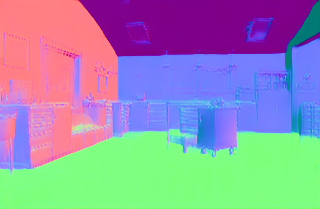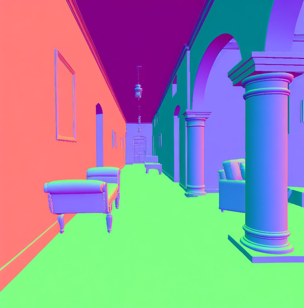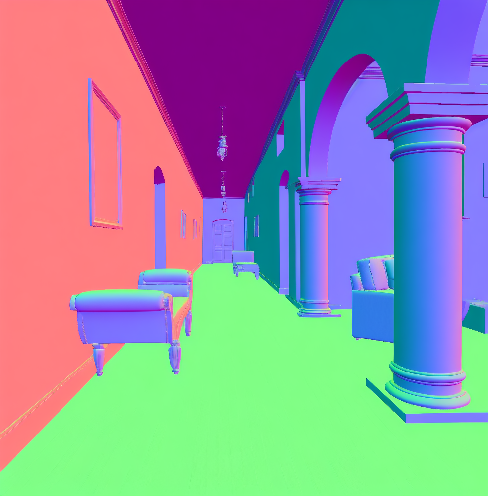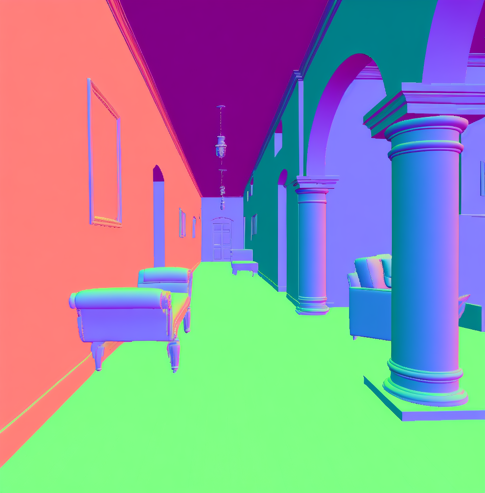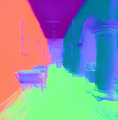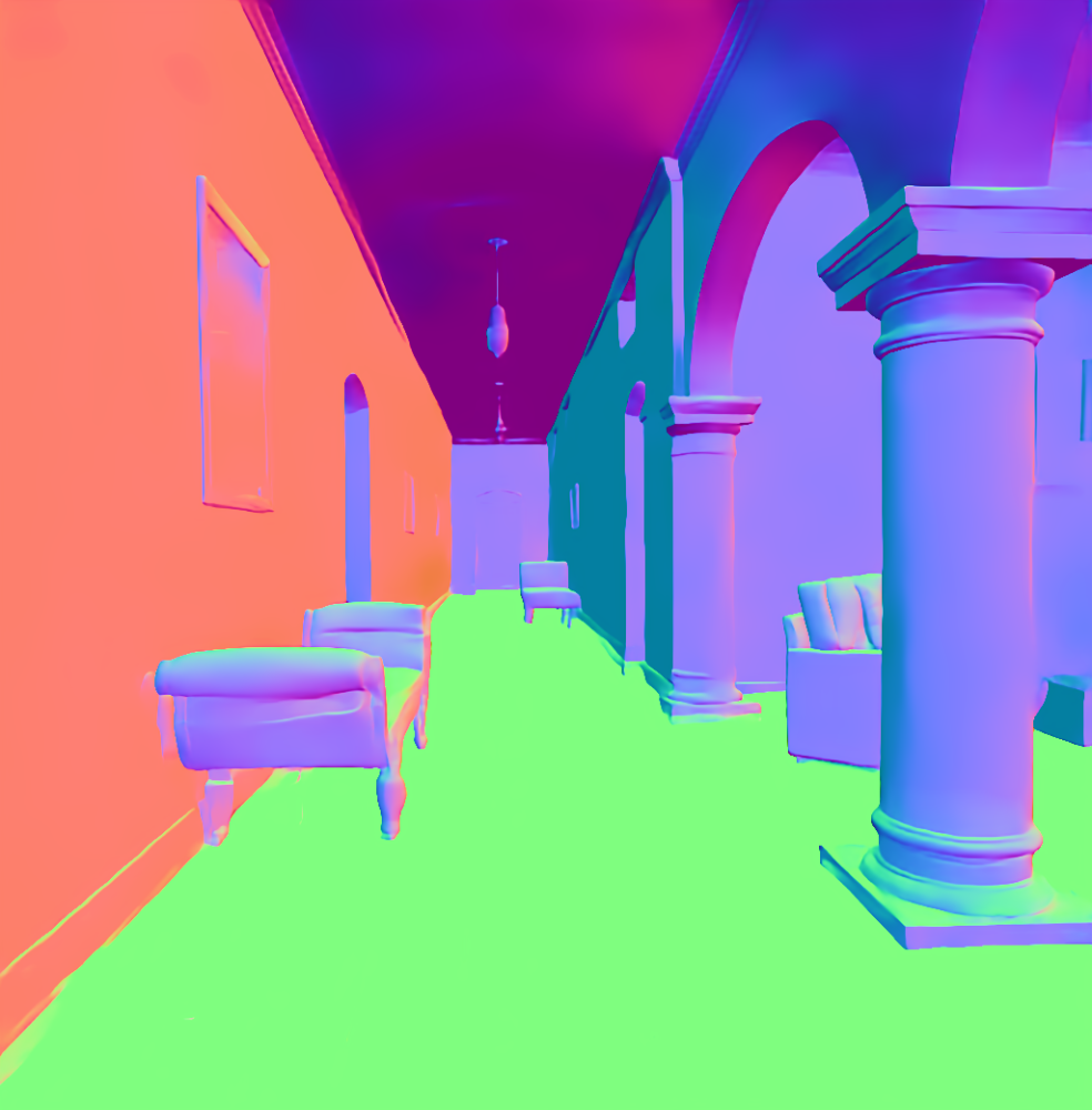 | Input image | Normal (Zhu et al. 2022b) | Normal (PVT-normal) | Normal (Ours RGB→X) seed 0 | Normal (Ours RGB→X) seed 1 | Normal (Ours RGB→X) seed 2 | Normal (Ours RGB→X) seed 3 | Normal (Ours RGB→X) seed 4 |
